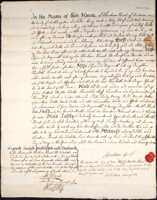 TO HOLD unto her the said Martha Hurst her Executors Administrators and Assigns for ever; AND LASTLY I Do hereby Nominate and Appoint her the said Martha Hurst full and Solo Executrix of this my Will Hereby Revoking all former and other Wills by me at any time heretofore made and Do Declare this and no other to be my last Will and Testament IN WITNESS whereof I the said Abraham Hurst the Testator have hereunto set my Hand and Seal this fifteenth Day of May in the Year of our Lord One thousand Seven hundred and Seventy Seven. |