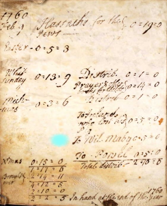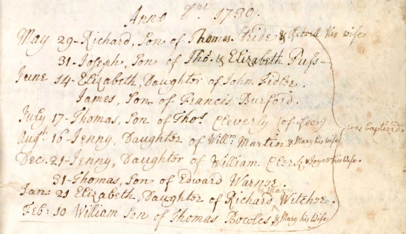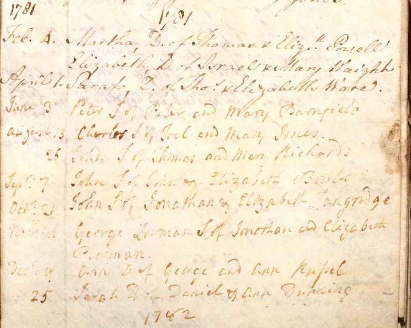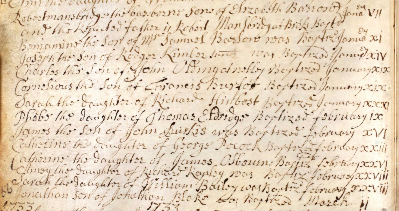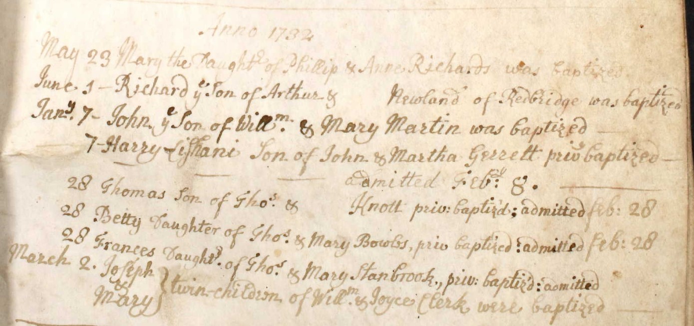 Another witness ... tells me that Mr Lukin said he had great difficulty in correcting this ???. Further, I have been informed that the "receiving into the church" was often preformed at home. I find W. Low??? ??? Sarah; but neither he, nor his brother, or ??? sister, ??? found. He told me the name of one of his Godfathers, & I have no doubt of his baptism. Mr. Casnener was non-resident, on account (the Licence states) of Nursling Rectory being situate in a tract of many miles of unwholesome murshy ground; the Clerk therefore in keeping minutes for registering, & accounting for fees, may have made ???. In the very year 1789 when Mr Lowman was left out, there is the entry of "Recieved into the church William, Banjamin, & Elizabeth the sons & daughter of John & Elizabeth Bowles, at several times privatly baptised. " One might have been forgotten; but three could not but cause inquiry. R. King was forgotten; but King being a large farmer wanted his ??? ??? for some purpose ??? ??? ??? interpolates the baptism on the ??? ??? of his fly-leaf memorandum which could not be correct.