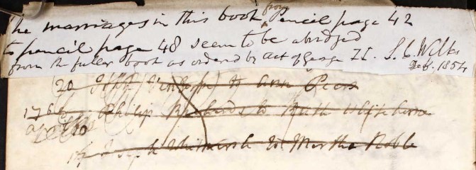 The marriages from April 14. 1752 (P.42) to June 18. 1780 (P.48) have been entered short, only names of the parties & dates, without clergymen or witnesses (as is the case in other parts of the book) - but beware using these entries for Certificates, the Act of George II c.26 having ordered a new book with fuller entries;- to which ???. This ??? ??? is I believe not always correct in spelling - but I have not ??? ??? of collation.