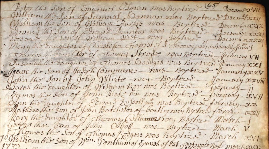 Opposite to this sheet on which I am writing is a note by ? Woodford Curate, 25 Dec. 1778 stating that "the Baptism of R. King was omitted, the service having been performed privately & the clerk not present so that it was not in the minutes which the Rector copied & entered in the register, but it was afterwards inserted by the Curate. " I found this a useful clue to what my ??? may find a difficulty, I have had many applications for certificates of entries, in former years, which are not to be found, though the families were well known parishioners & church people. Thus, W. Lowman, wishing for a Baptism Certificate, says he was born in 1789, had a sister Sarah about 7 years younger & ??? another sister; his son Ray were all baptised, and received into the church ("christened") & that it was in his ??? & his father's the custom for the children to be baptised at home. Another witness (over)