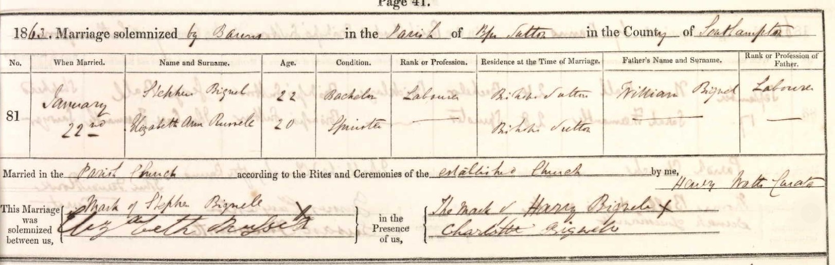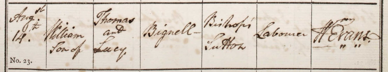 Probably due to the times, and general level of illiteracy, the spelling of surnames fluctuates. The current consistent surname is Bignell, and that will be our theme irrespective of the spelling on individual documents, unless stated otherwise.