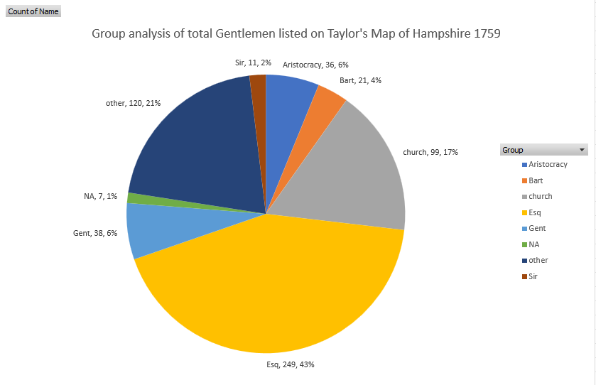 Using the information in the abovementioned spreadsheet, I have also created an ESRI / ArcGIS Story Map which shows the location of the places of abode, indicated by numbers on Taylor's map, on a modern map. Follow the link to go directly to Taylor's Map of Hampshire 1759 and the places associated with the List of Gentlemen or see the slightly squeezed version embedded below.