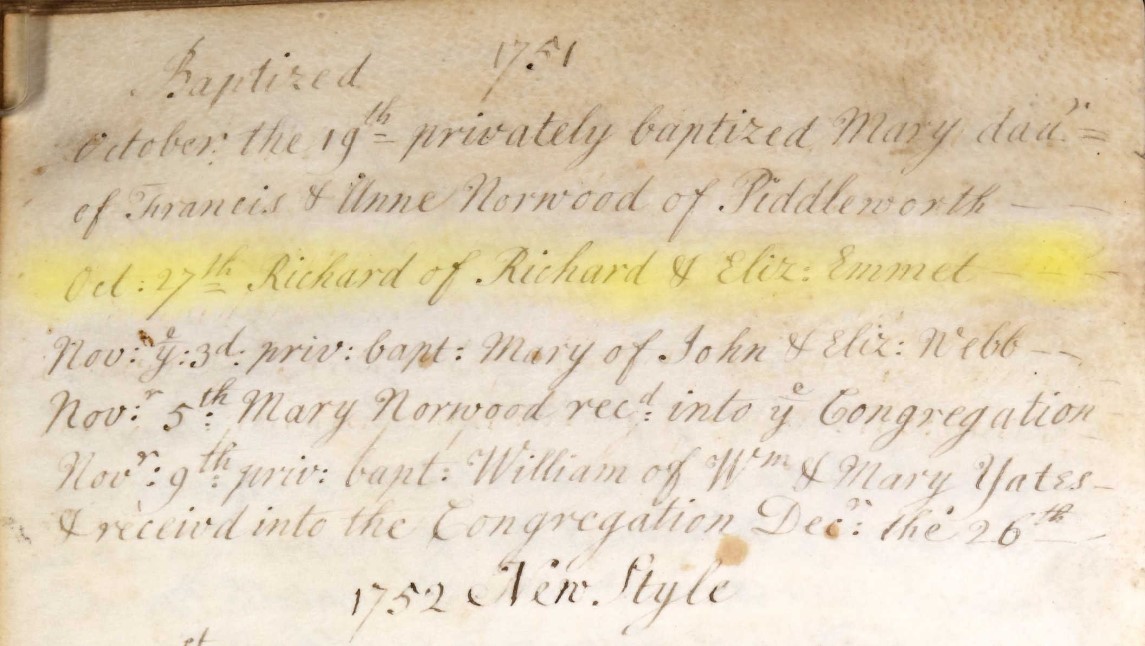 Jany the 6th [1754] baptised James of Richard & Elizabeth Emmet