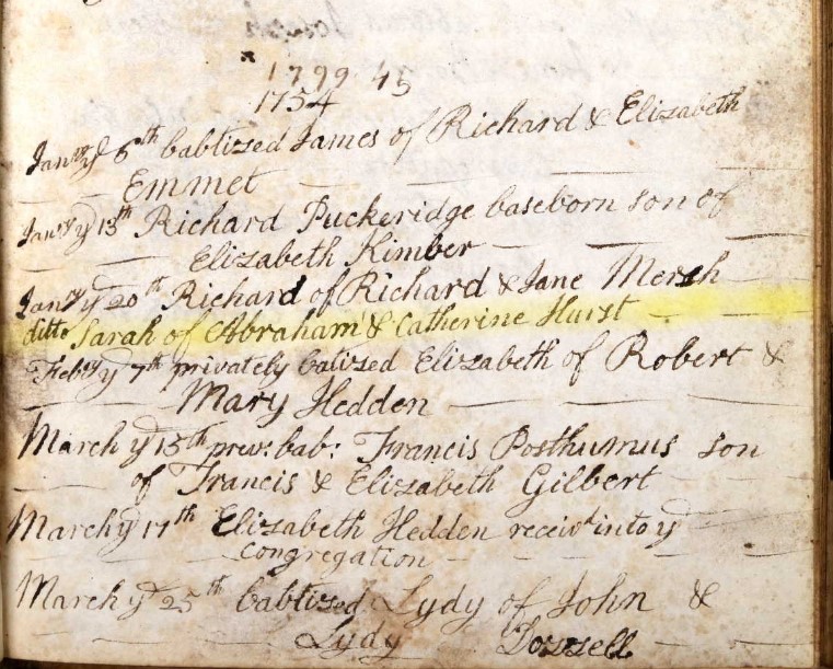 Jany 20th [1754] Sarah of Abraham & Catherine Hurst. {Highlight Yellow}