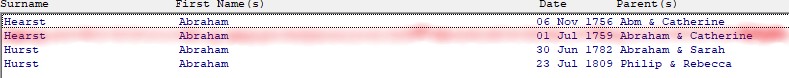 There are 5 baptisms out of 21 on the page. That is nearly 25% of the baptisms are to the surname Hurst. This gives some indication of the presence of Hurst families in the community. Perhaps not 25% but not insignificant.