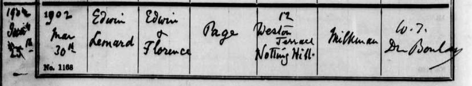 Edwin Leonard Page born 25th Jan 1902 to Edwin & Florence Page of 12 Weston Terrace, Notting Hill, a Milkman, was baptised at St Mary's Bolton Parish Church in the county of London, on 30th Mar 1902.