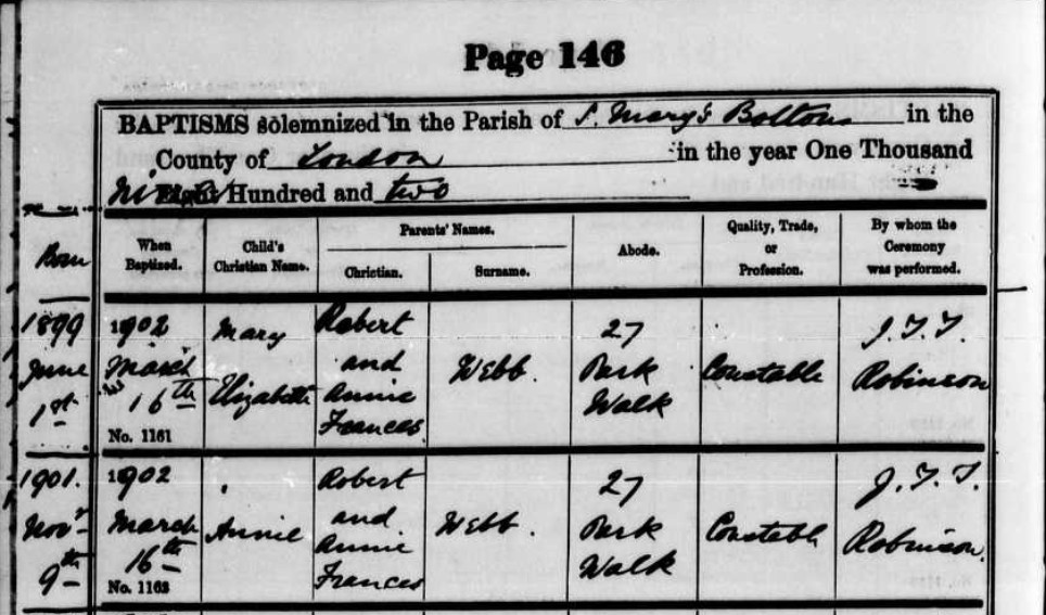 The church, St Mary's Boltons, is located south of Old Brompton Road. I assume that the address recorded in the baptism record is not local as it is notated with Notting Hill. Generally, on the rest of the page, there are no such notations.